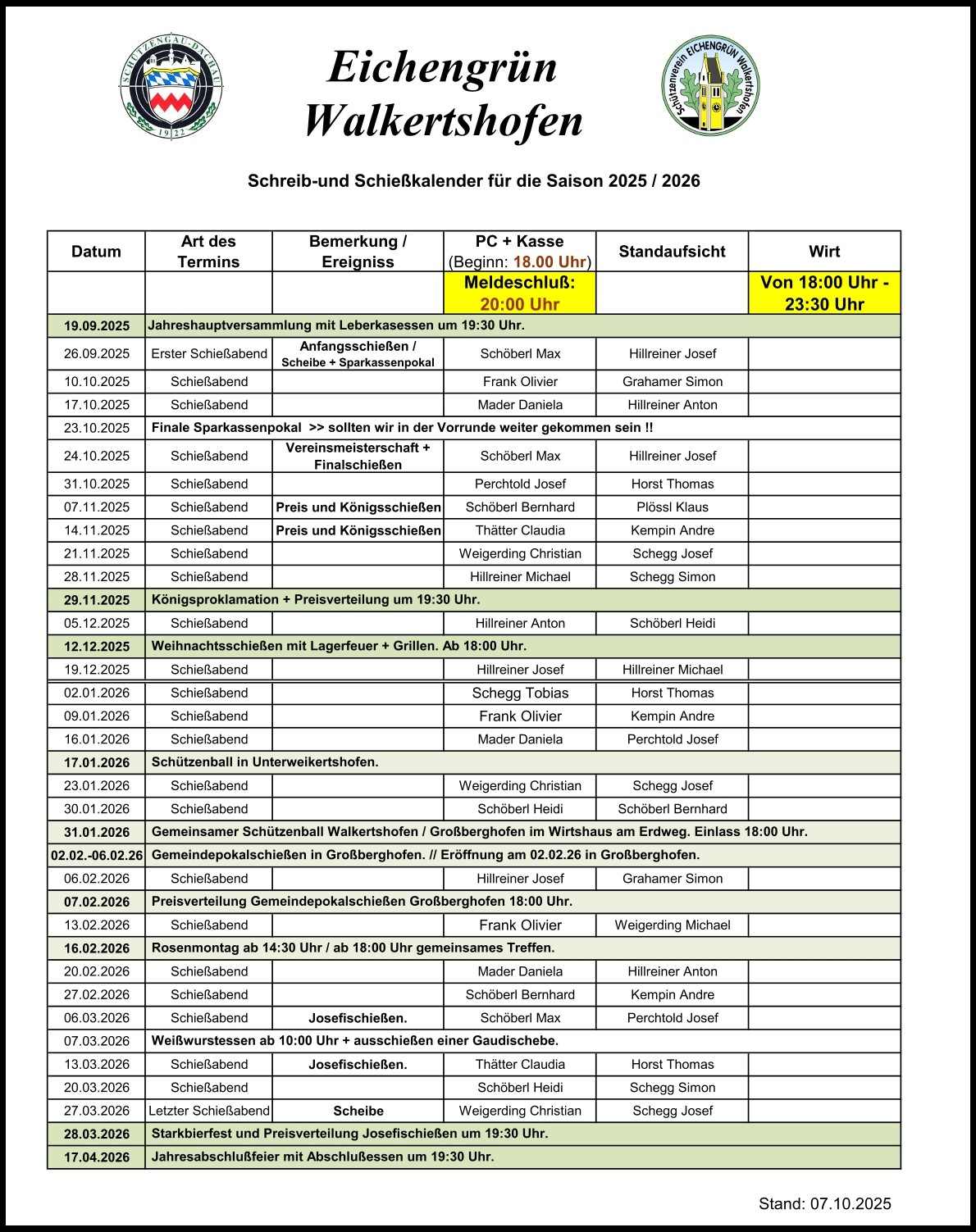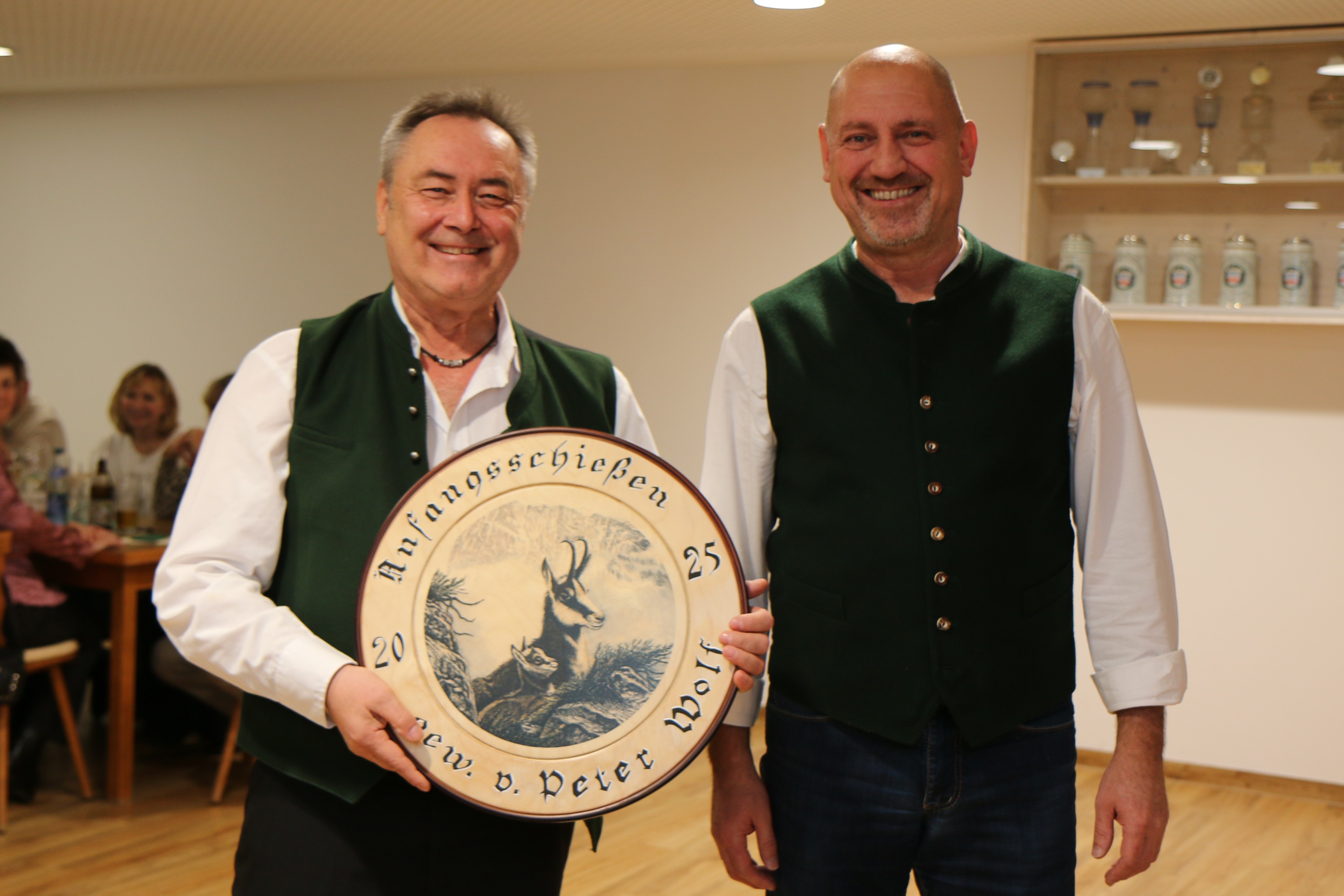 Anfangsscheibe 2025Foto: Josef PerchtoldAm Freitag den 26.09.2025 hat die aktuelle Schießsaison begonnen. Zu diesem Anlass wurde wieder eine Anfangsscheibe ausgeschossen. Im Rahmen der Preisverleihung und Königsproklamation wurde diese feierlich an Peter Wolf überreicht, der diese mit einem 16,7 Teiler gewonnen hat.